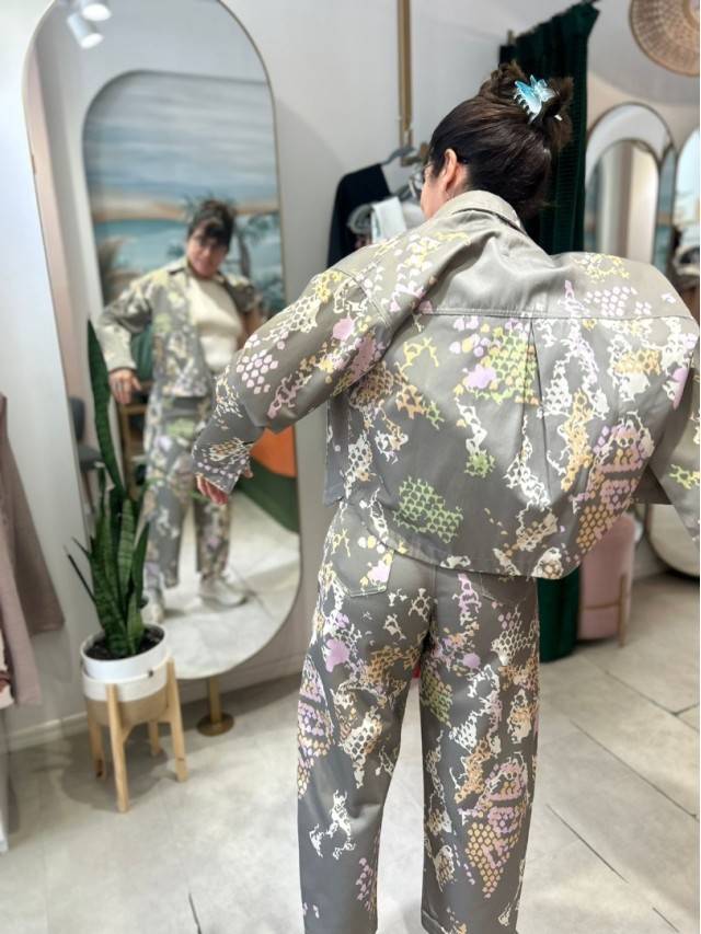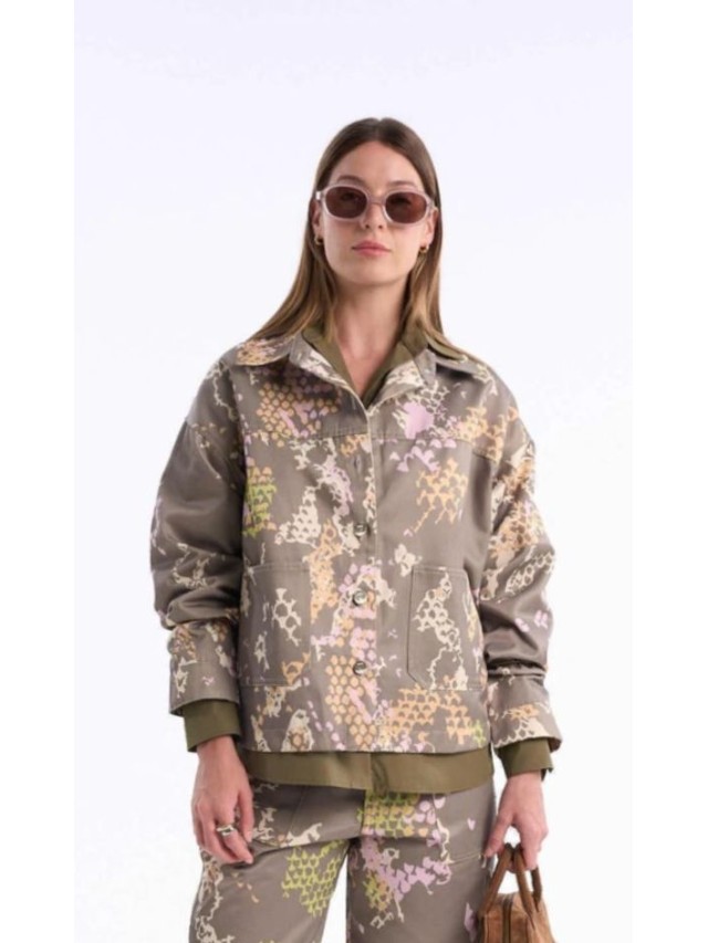 Chaqueta confeccionada en sarga, con dos bolsillos plaque en el delantero y en la espalda posee un canesú con pinza.