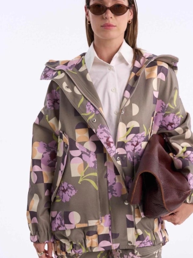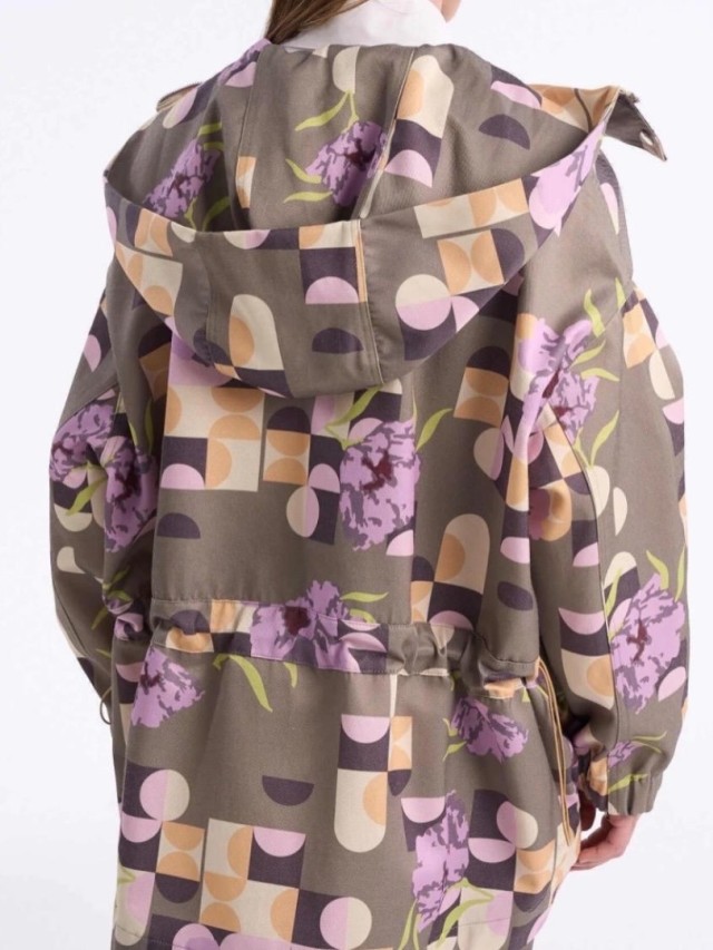 Parka confeccionada en sarga. De silueta amplia y relajada, con capucha, cartera con cierre y broches. Puños y bajo delantero con elástico. bolsillos en el frente. En la parte trasera tiene jereta externa con tranca y cordón elástico.