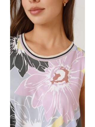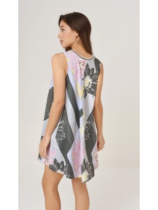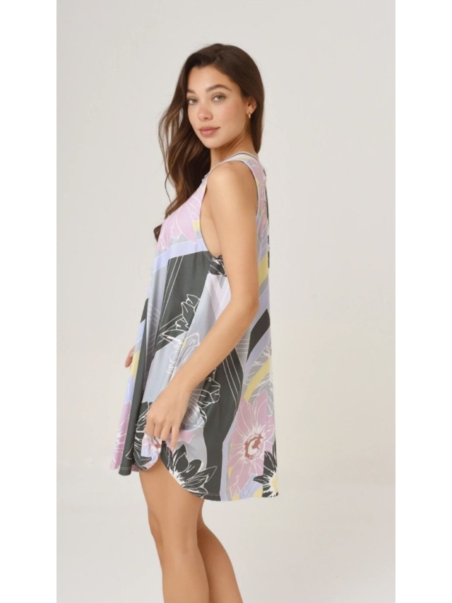 Vestido corto cuyo largo modular es por arriba de las rodillas, su corte es amplio brindando un gran vuelo, tiene cuello tejido.